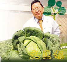 彭樹勳與用長科生態肥種植的巨型有機椰菜。該椰菜種了三個半月,直徑已達15英寸,一個人雙手也環抱不了。
