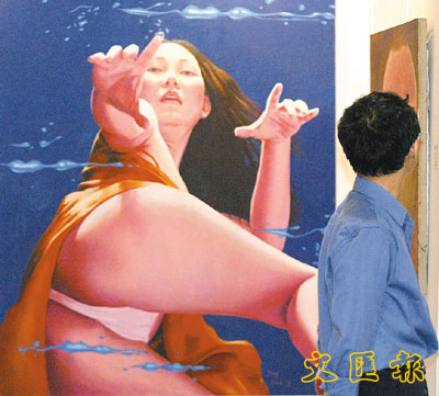男人看著的一幅油畫「Touch」由當地藝術家所畫,現展出於上海春季美術展。這一連五天的美術展由六月六日開始,百多名中國的畫家、雕塑家及表演藝術家將雲集於這個活動。