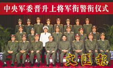 20日,中央軍委在北京中南海隆重舉行晉升上將軍銜警銜儀式。這是晉銜儀式結束後,江澤民、胡錦濤等領導同志和晉升上將軍銜警銜的軍官警官合影留念。 (新華社)