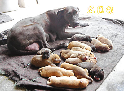 洛陽市伊川縣城關鎮北街村,村民謝六社養的一隻名叫「小黑」的母狗產下16隻狗寶寶,其中2隻不善爭食的小狗在14日夭折。 (新華社)