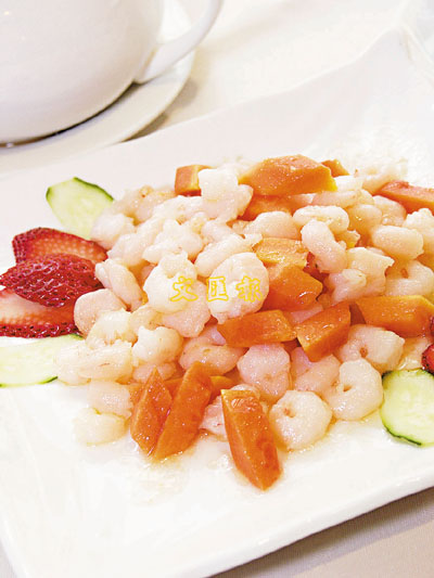 演變自龍井蝦仁,是王師傅特別為夏天而創作。蝦仁為杭州河蝦,配以新鮮水果,如火龍果、木瓜等,每次配搭或有所不同,取決於當天的時令選擇。