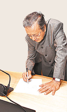 在馬哈蒂爾助手不斷催促下,輕鬆愉快地訪談終於在不捨之中結束。當有人提議讓馬哈蒂爾給香港《文匯報》題詞時,還未等翻譯,他就立即在桌上鋪開一張白紙,拿起筆認真地寫下:「《文匯報》和《南洋商報》的合作將為兩報讀者提供更多更準確的新聞。向《文匯報》讀者致意。」