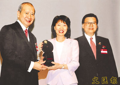 管協主席李國寶(左一)頒贈大獎予中華電力有限公司常務董事阮蘇少湄(中),右一為「優質管理獎」籌委會主席陳永堅。