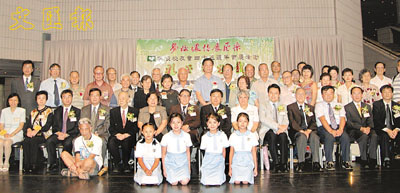 主禮嘉賓與參展者在勞校校友會45周年會慶書畫攝影展開幕式上合影。 (鄭群 攝)