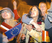 拉脫維亞人正在首都里加(Riga)的廣場慶祝以全民公決的方法決定加入歐盟。
