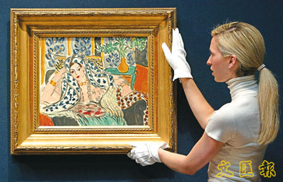 在倫敦一拍賣會開始前,工作人員把大師馬蒂斯(Hemi Matisse)一幅名為「Odalisque au fauteuil noir」的畫作掛起,此畫估計約值一千萬美元。