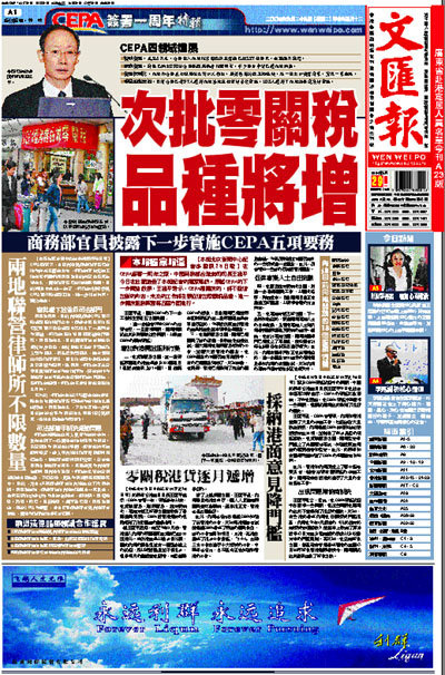 二、在貨物貿易方面,第一批實施零關稅的港產品涉及273個稅目(稅號轉換後為374個),而按照CEPA的規定,目前兩地已經就明年即將實施的第二批零關稅產品清單進行磋商,今後對於原產於香港的產品將盡快基本實現全部開放。