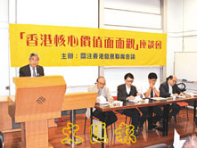 【本報訊】(記者 梁祖蓮)關注香港發展聯席會議昨日舉行「香港核心價值面面觀」座談會,與市民探討近期關注的核心價值問題。有學者指出,香港的核心價值必須正確地追溯真實的歷史,才能展望將來。因為中國是輔助香港創造經濟奇蹟的一大因素,香港的民主始自實踐「一國兩制」,而香港成功落實「一國兩制」則有助引導台灣和平回歸祖國。