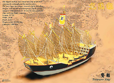 鄭和下西洋的寶船,主要負責輸送作戰人員,船長六十七點九公尺,寬二十六點六公尺,吃水深度五公尺,五至六桅,載重量二千噸。(網上圖片)