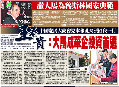 日前,在吉隆坡的中國大使館會客廳內,中國駐馬大使王春貴會見了本報社長張國良率領的訪馬代表團及馬來西亞南洋商報集團總編輯洪松堅。王大使介紹說,今年是中馬關係自建交以來最好的時期。
