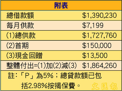 假設經九成按揭保險計劃,購入市值$150萬之物業,分20年還,按揭息率為全期「最優惠利率(P)-2.75%」,並有1%按揭金額現金回贈,有關之買樓「整體付出」將為HK$1,864,260 (見附表)。