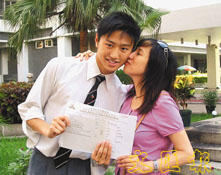 喇沙書院學生劉鎮然獲得3A,媽媽梅小青到學校吻賀兒子。