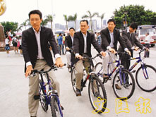 龔耀輝(左一)宣佈出選立會會計界議席,並以踏單車方式展示新一輩會計師的活力。(梁祖蓮 攝)