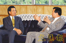 新任日本駐港總領事北村隆則(左)與本報社長張國良暢談港日文化交流。(趙焜崗 攝)