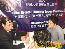 【本報訊】(實習記者 郭嘉曦)高考已放榜,中學會考結果亦快將公佈,不少考生面對升學、就業問題。蘇州大學昨日在第三屆教育博覽會中介紹與加拿大亞瑟柏大學合辦的工商管理雙學士學位課程。有市民就坦言對本港前景不樂觀,認為內地經濟環境較優,內地大學不比香港遜色,希望其子女能赴內地升學。亦有應屆高考生視該課程為首選,對聯招結果不太看重。
