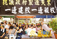 【本報訊】(實習記者 沈清麗)超額教師昨日下午在中區皇后像廣場舉行第二次24小時絕食行動,有一百多名教師參加,行動預定今日下午4時結束。教協會長張文光強調,超額教師失業數字仍然高企,至今仍有逾300名教師未找到工作。有參加絕食的超額教師表示,曾寄出超過40封求職信,但都沒有回音。圖為參加絕食行動的教師在抗議橫額下靜坐。
