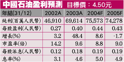 中石油2004年上半年產量穩定增長,加上實現油價上升,我們會調高其盈利,由之前的下跌9%,改為上升8.6%。上半年中國石油重點管道工程形勢良好,西氣東輸工程西段建設穩步推進,預期天然氣在未來數年將高速增長。另外,旗下的煉油及市場推廣部分,在下游產品復甦的帶動下,將持續向好。以2004年預期市盈率8.8倍,及5.0厘股息率計,屬吸引,維持買入建議。