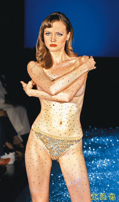 羅馬時裝展上,半裸模特兒展出Gianni Galignano的「皇后的新衣」。