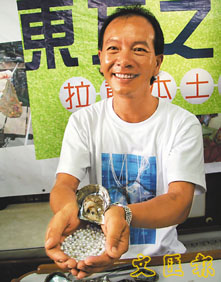 葉定民展示3年來珍珠養殖場的成果,相信政府政策配合,將可發展本土經濟,長遠更可每年帶來8億元的收益。 (羅敬文 攝)