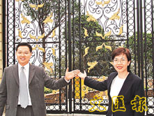 長實高級營業經理郭子威(左)及營業經理梁婉君介紹畢架山1號大門,每扇門重達3噸以包金作裝飾,特顯豪宅氣派。(周穎攝)