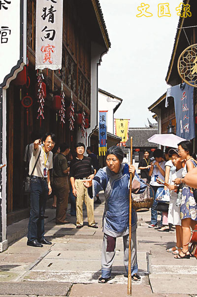 古城紹興以「祥林嫂」形象吸引遊客。文學大師魯迅的《祝福》為中國現代文學塑造了一個祥林嫂形象。紹興為了打造文化品牌,由真人扮演的「祥林嫂」,其逼真的神態吸引了遊客的關注。(中新社)