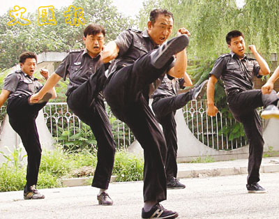 北京昌平警方夏季高溫酷暑時節,對巡警、防暴警進行警棍基本格鬥法、拳腿法組合動作、快速出槍等項目培訓。 (中新社)