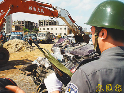 【本報珠三角新聞中心記者鄭海龍、實習記者王夢婕、通訊員曹勇深圳23日電】深圳海關緝私局昨日在惠州市郊,用巨型挖土機將1000多部走私汽車和汽車切割件拆解處理。 這批被拆解的汽車及切割件是深圳海關緝私局下屬的惠州分局、惠東分局和惠州港分局自1999年以來查獲的,包括走私整車46台、切割件1260件。在這些汽車切割件中,許多車廂、車頭都有被切割的痕跡,在被切割的地方經焊接後,又重新噴上一層漆。