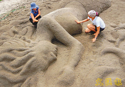 韓國學生周六在漢城漢江旁邊的公園用沙砌成美人魚。 (法新社)