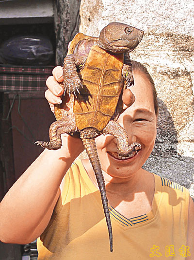 25日,福建省漳浦縣綏安鎮柯女士向記者展示她購得的一隻怪龜。該龜尾長竟達17厘米,頭部碩圓喙鉤,酷似貓頭鷹。(新華社)