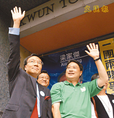 泛民主派在九龍東的參選隊伍昨日到觀塘遞交參選表格,他們將分拆兩張名單出戰。民主黨的李華明將聯同胡志偉及何偉途合組名單,而「大狀」梁家傑則單獨在該區參選。李華明認為,分拆名單將有利於爭取該區新增的第五席,而梁家傑的「空降」,則可令不欲支持民主黨的「民主派」選民,改投梁家傑。另外,面對配票的問題,李華明直言他會主力在觀塘拉票,而民主黨立法會議員司徒華及張文光則會協助胡志偉在黃大仙工作。 (葉傲冬 攝)