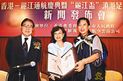 主辦香港-麗江通航暨「麗江盃」滇港足球友誼賽的香港奧委會、香港文匯報、麗江市人民政府及中國東方航空雲南公司,特於昨日假金鐘萬豪酒店舉行發布會,公布首航及足球友誼賽的詳情,並邀請了香港奧委會會長霍震霆、本報副社長劉永碧、麗江市副市長楊一奔、東方航空雲南公司副總經理萬能松出席。