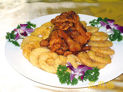 2. 蘋果去皮切成金錢狀,拍上濕澱粉後粘上蛋液及麵包糠,炸至金黃色與堹嶆蛈P放於碟上即成。