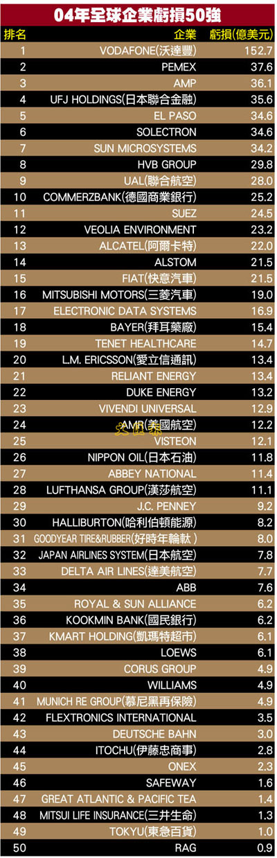 《財富》雜誌每年發表的全球500大企業排名例必成為財經界熱門話題,「全球虧損50強」同樣惹人注目。英國流動電訊商沃達豐(Vodafone)本屆以勁蝕近千二億港元「榮」登榜首,堪稱「虧損之王」,反映幾年前電訊業的非理性天價收購後遺症至今猶在。03年亞洲區爆發的沙士疫症與伊拉克戰事等外圍不穩因素,對航空業的衝擊從未停止,5家登榜的航企共計虧損金額超過520億港元。至於500強排名一年內急挫106位的日本三菱汽車,則因涉嫌長期隱瞞產品質量問題致使名聲一落千丈,高級管理層成批被炒被捕,而三菱汽車的名字則成為現代企業管治差劣的典範。