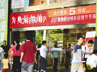 銀泰百貨大門上方「為奧運加油」的紅色橫幅,吸引了不少市民前來購物。(邊雋 攝)