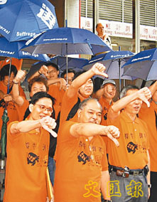 曾健成報名時與支持者一起做出其招牌的「倒董」手勢。