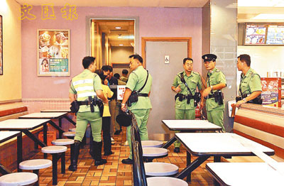 【本報訊】兩名假扮成探員、配備手槍及手銬的劫匪,昨午跟隨一名金飾經紀進入大角咀麥當勞快餐店,並趁事主小解時,亮槍行劫,搶去其載有330襾金飾的手提包,劫匪離去時並用手銬鎖著事主雙手扣於廁板,清潔女工事後聽到呼救聲入內發現報警,警員到場需用大鐵鉗剪開手銬,才將事主救出,而被劫金飾總值85萬元。