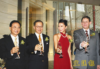 鷹君集團副主席兼董事總經理羅嘉瑞(左二)及朗豪酒店董事總經理貝秉智(右)為朗豪酒店開幕祝酒。(張偉民 攝)