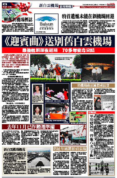 今晚的白雲機場似乎比以往更加繁忙和緊張。廣東省機場管理集團公司在此舉行最後一個離港航班的歡送儀式。國家民航總局副局長楊國慶、廣州市常務副市長林元和及廣東省機場管理集團公司總裁張春林等參加了儀式。