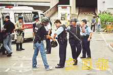 荷槍實彈警員在遇劫銀行附近搜捕匪徒。