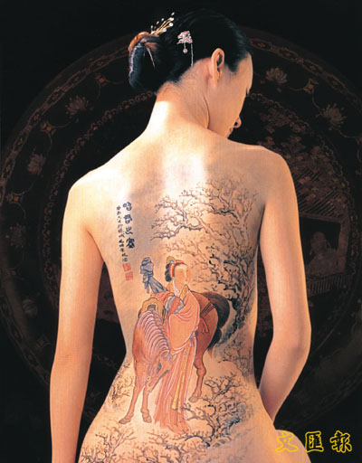 在剛過去的書展,書海人海中,偶然,數朵牡丹綻開、兩尾金魚游躍,就在一名女郎的前胸後背和粉頸之上。來自廣州的國家一級美術師龐國華,為著出版其人體彩繪攝影集《色藝無間》,在書展上即席示範作畫,欲推廣人體彩繪至香港。