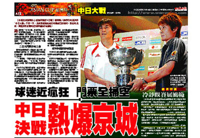 【本報北京新聞中心記者劉凝哲6日電】距明晚八時舉行的亞洲杯「中日大戰」不到一天,北京球迷幾近瘋狂的情緒已被點燃。現在的北京,與亞洲杯決賽的任何事物都成為焦點。