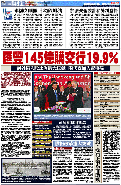 ¡@¡i¥»³ø¥_¨Ê·s»D¤¤¤ß°OªÌ§õ³·¿o¡B°OªÌ¶À¹ö¨à¹q¡j¶×Â×±±ªÑ(0005)¸¨¹ê³z¹L»´ä¤W®ü¶×Â׻Ȧæ¡A¥H144.61»õ¤¸¤H¥Á¹ô(¬ù17.47»õ¬ü¤¸)¤JªÑ¤¤°ê²Ä¤¤j»È¦æ¡X¡X¥æ³q»È¦æ19.9%ªÑÅv¡A¯A¤Î77.75»õªÑ¡C¬O¦¸¥æ©ö¥O¶×Â׳ФU¥~¸ê»È¦æ¤JªÑ¤º¦a»È¦æªº³Ì¤j©v³æ¶µ¥æ©ö¬ö¿ý¡A¦¹¥ç¬O¶×±±Ä~¤JªÑ¤W®ü»È¦æ¤Î¥¦w«OÀI«á¡A¦b¤º¦a²Ä¤T©v¤j«¬¦¬ÁÊ¥æ©ö¡C