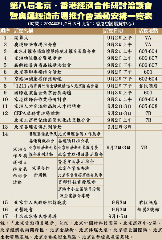 [2004-09-01] 第八屆北京•香港經濟合作研討洽談會暨奧運經濟市場推介會活動安排一覽表