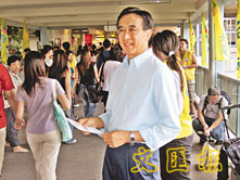 【本報訊】(實習記者 郭嘉曦)立法會選舉進入倒數階段,自由黨主席田北俊昨日先後到粉嶺及上水火車站等人流密集的地方派發傳單。如常地,田少在拉票時依然「西裝骨骨」。他笑言,不擔心一身西裝會令他與市民有距離,而商界一直對他的工作感到滿意,有信心普羅大眾亦對他有同感。
