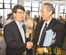 科大校長朱經武(左)表示,行政長官董建華關心香港工商業的發展,並於昨日來電研究香港如何向高科技發展,從而改善整體經濟。右為立法會議員呂明華。 (張立新 攝)