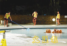 屯門賽馬會仁愛堂泳池發現紅蟲,救生員正在清洗泳池。