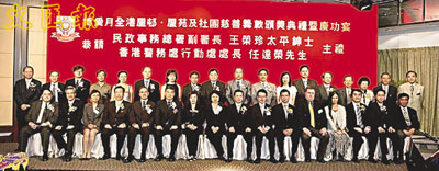 【本報訊】(記者 鄭群)一年一度的「博愛月全港屋h、屋苑及社團慈善籌款」已圓滿結束,而頒獎典禮暨慶功宴亦於日前假尖沙咀美麗華酒店舉行。大會邀請民政事務總署副署長王榮珍太平紳士及香港警務處行動處處長任達榮擔任主禮嘉賓,頒發獎項予10大屋h及團體,場面熱鬧。