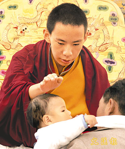 7日,十一世班禪額爾德尼•確吉傑布在日喀則新宮德慶格桑頗章為藏族廣大信教群眾摸頂賜福,並賜予十一世班禪畫像和經班禪加持的紅色金剛結。摸頂是藏傳佛教中活佛高僧為僧人和信眾賜福、消災、避難的一種宗教儀式。當天是十一世班禪坐床以來在西藏第三次大規模地為信眾摸頂賜福。 (新華社)