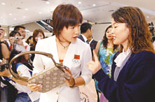 女子百米蛙泳金牌選手羅雪娟在澳門商埸選購手袋。(中新社)
