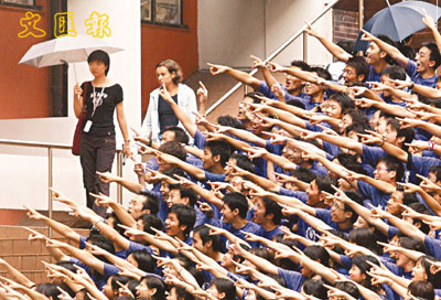 開學了!香港大學向來極重舍堂生活,作為一個「hall友」眾舍堂學生每天均過著朝6晚2的生活,朝早忙著飲茶、凌晨時分又忙著食宵夜,還要一整個星期接受舍堂迎新活動的「洗禮」。不過精力充沛的新生們,顯然沒有給嚇怕。圖中的大學生在細雨紛飛下,依舊手指指、高歌一曲,來張大合照,顯然,他們盡皆享受大學生活。 (劉國權 攝)